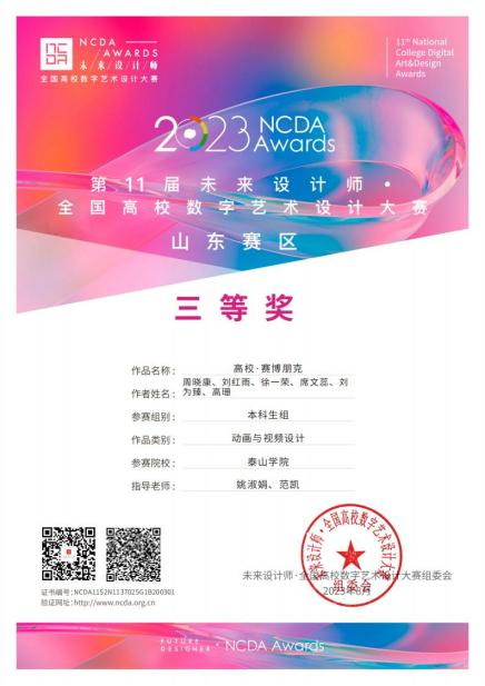 2023年8月,由工业和信息化部人才交流中心、未来设计师·全国高校数字艺术设计大赛组委会主办的第十一届未来设计师全国高校数字艺术设计大赛在正式落下帷幕,在此次大赛中我院姚淑娟老师和谢国庆老师指导的崔圣杨、孔德中、隋心怡、刘佳、王传禛、马芊芊同学的作品《听见》获得二等奖,由姚淑娟、范凯老师指导的周晓康、刘红雨、徐一荣、席文蕊、刘为臻、高珊同学的作品《高校·赛博朋克》获得三等奖。