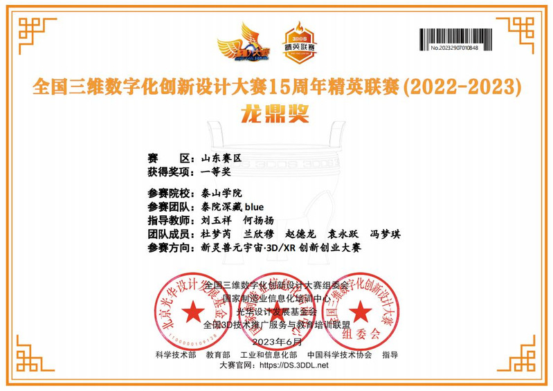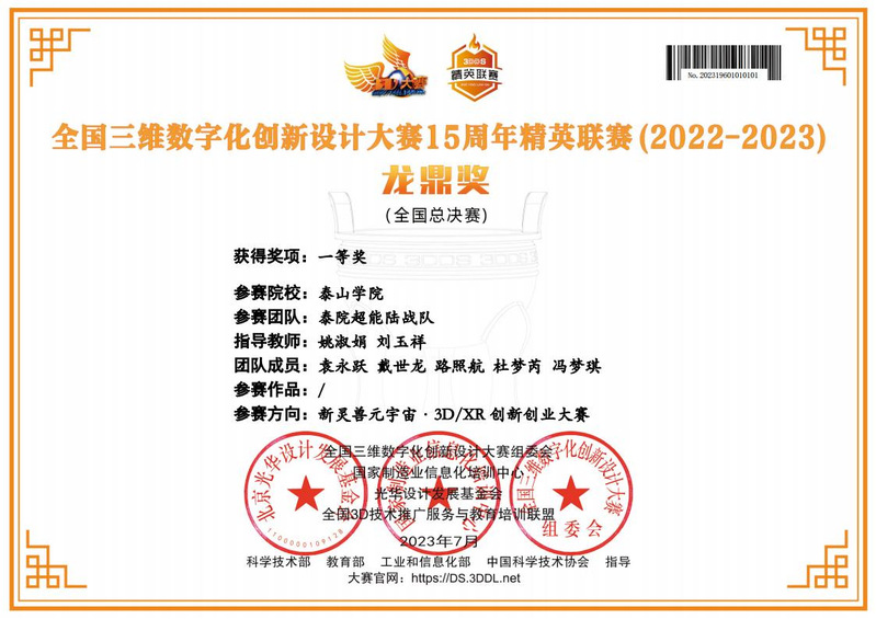 2023年8月,由国家科技部、工信部、教育部、中国科协等部门指导,国家制造业信息化培训中心、全国三维数字化技术推广服务与教育培训联盟(3D 动力)、光华设计发展基金会等单位共同主办,北京昆仑三迪科技发展有限公司与国家制造业信息化培训中心3D办联合承办的全国三维数字化创新设计大赛15周年精英联赛·龙鼎奖落下帷幕。在此次大赛中,我校文学与传媒学院姚淑娟老师和刘玉祥老师指导的袁永跃、戴世龙、路照航、杜梦芮、冯梦琪同学组成的泰院超能陆战队荣获全国总决赛一等奖;刘玉祥老师和何扬扬老师指导的杜梦芮、兰欣修、赵德龙、袁永跃、冯梦琪同学组成的泰院深藏blue队获山东赛区一等奖。