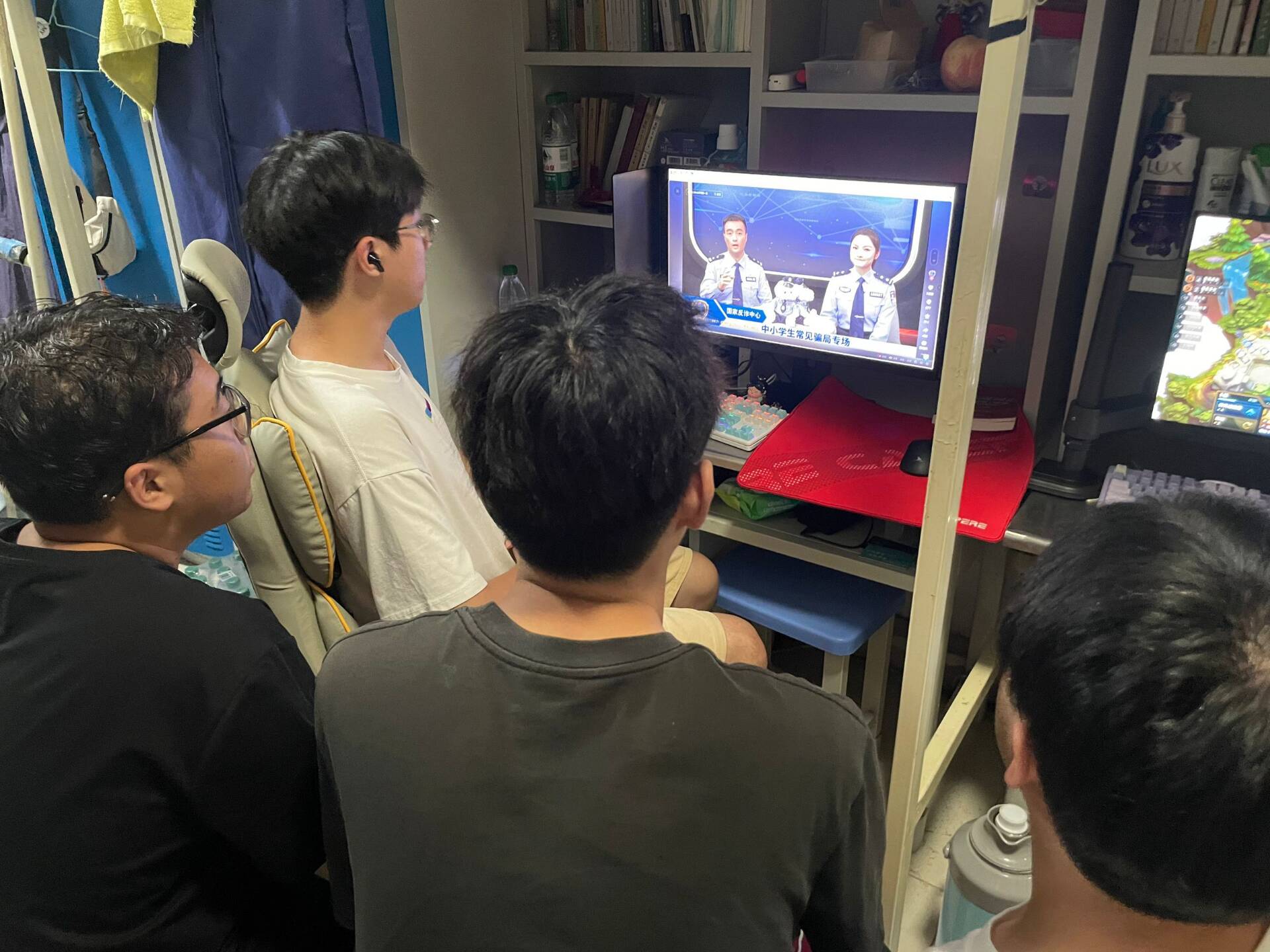 同学们以宿舍为单位观看直播,在观看反诈骗网络直播的过程中,同学们全神贯注地投入其中。宣传反诈骗知识的民警以生动形象的方式介绍了常见的诈骗手段和案例,同学们聚精会神地聆听着,不时露出惊讶的表情。随着直播的深入,民警详细讲解了如何识别和防范诈骗,同学们认真做着笔记,还积极与身边的舍友互动,提出自己的疑问和想法。
