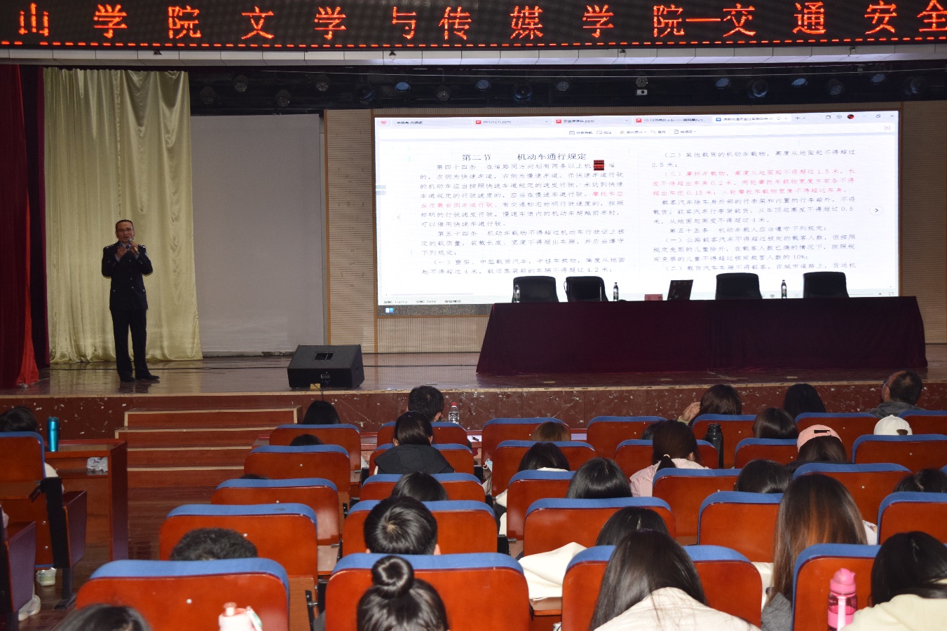 10月25日,文学与传媒学院于新生一部大学生活动中心开展交通安全知识专题讲座,本次讲座特别邀请泰安市公安局交警支队岱岳区岱西大队满庄中队中队长王勇警官担任主讲,文学与传媒学院新生一部全体学生共计400余人参加,学院团委书记彭晓主持讲座。