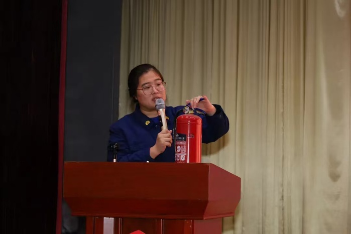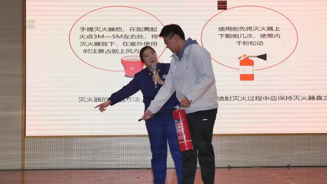 在讲座中,王琪教官结合多年的消防救援经验,通过实际案例、生动的图片和直观的视频,展示了火灾可能带来的严重危害,直击人心,让同学们深刻认识到消防安全的重要性。他围绕冬季火灾高发的特点,详细讲解了火灾预防的关键要点,如规范用电、禁止私拉乱接电线、定期检查电器设备以及保持疏散通道畅通等。此外,王琪教官现场演示了灭火器的正确使用方法,讲解了“一提、二拔、三握、四压,对准火焰根部喷射”的操作要领。为进一步增强实操能力,他邀请部分同学上台实际操作,同学们在教官的指导下迅速掌握了灭火器的使用方法,理论与实践紧密结合,现场气氛热烈。