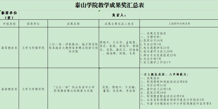 根据《关于做好省级教学成果奖预申报暨泰山学院2025年教学成果奖评选工作的通知》(教处字〔2025〕4号)有关要求,经完成人申报,学院组织专家评审,拟推荐“三位一体·四轮驱动:地方师范院校卓越语文教师培养模式创新与协同实践”、““五位一体”的山东省中小学影视教育模式的探索与实践”2项成果参加校级教学成果奖评选。