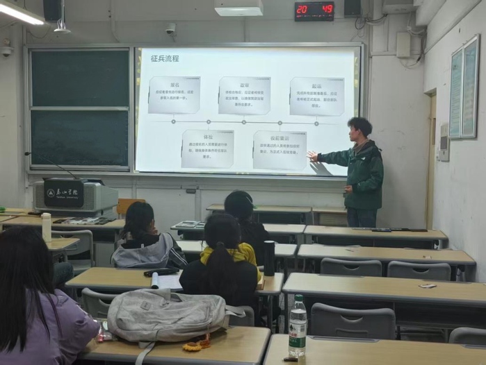 宣讲中,康向勇同学首先介绍了2025年征兵工作的基本情况,包括征兵时间、应征年龄规定及重点征集对象等内容,并强调了大学生在征兵工作中的重要地位,鼓励学生积极响应国家号召。接着,他详细解读了征兵政策,涵盖报名条件、征集流程及优待政策等方面,帮助同学们全面了解参军入伍的相关信息。然后,他结合自身服役经历,分享了军营生活的体会,从身心锻炼、技能提升到纪律养成等多个角度,生动展现了军旅生涯的独特魅力。最后,他结合当前就业形势,深入剖析退伍军人在职业发展中的独特优势,着重指出退役军人在升学考试中享有的加分政策,鼓励同学们将参军入伍纳入人生规划。他的讲解深入浅出,进一步激发了同学们的参军热情,为学院征兵工作的顺利开展奠定了坚实基础。