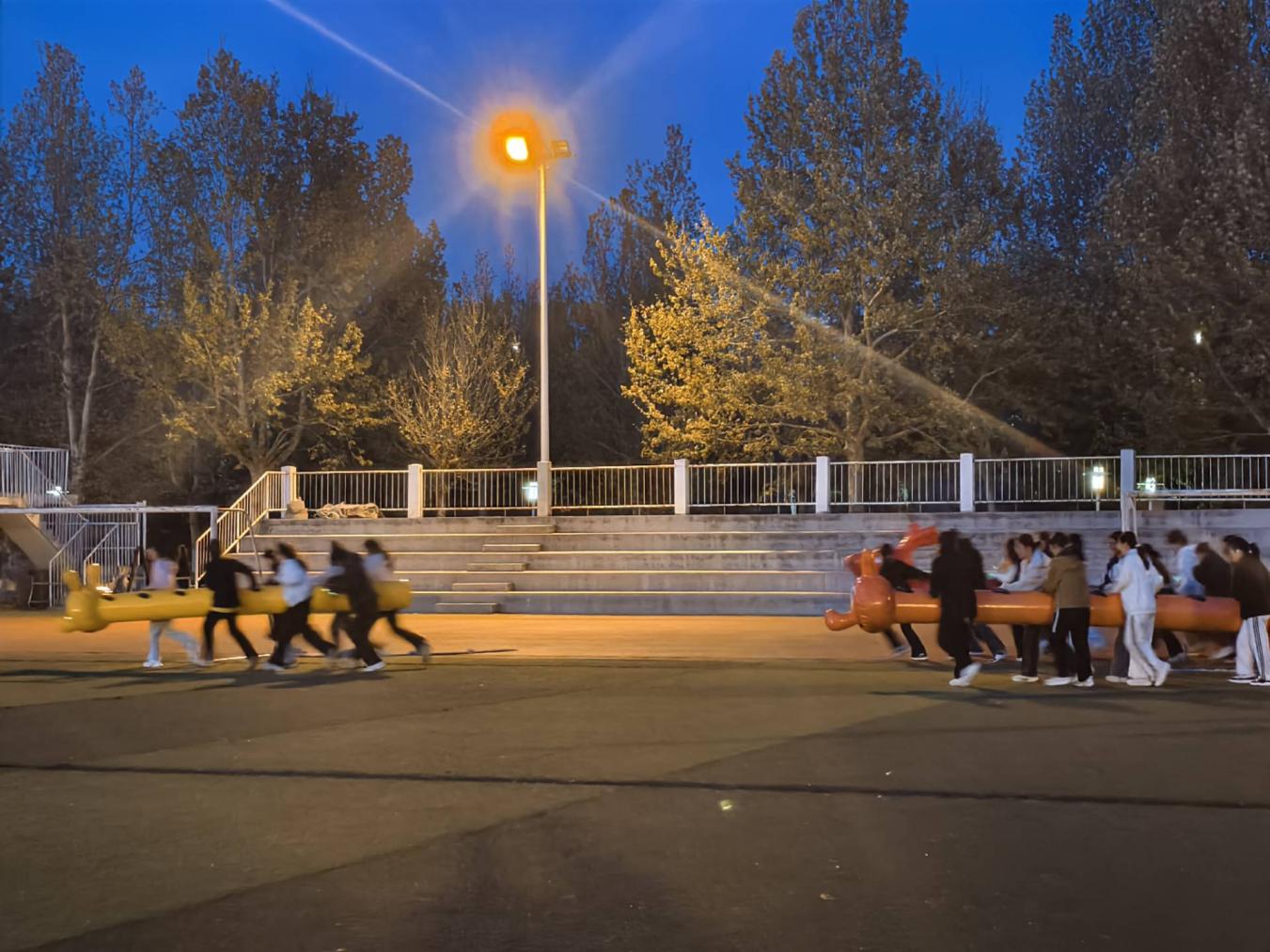活动首项环节“骑龙赛跑”率先拉开帷幕。十支跨院系自由组队的参赛队伍骑乘特制充气龙形道具,在50米赛道上展开激烈竞速。参赛队员默契配合、奋力冲刺,现场欢呼声此起彼伏。该环节以趣味化形式打破传统运动模式,既考验体能,更强调团队协作精神,充分展现了青年学子的蓬勃朝气。