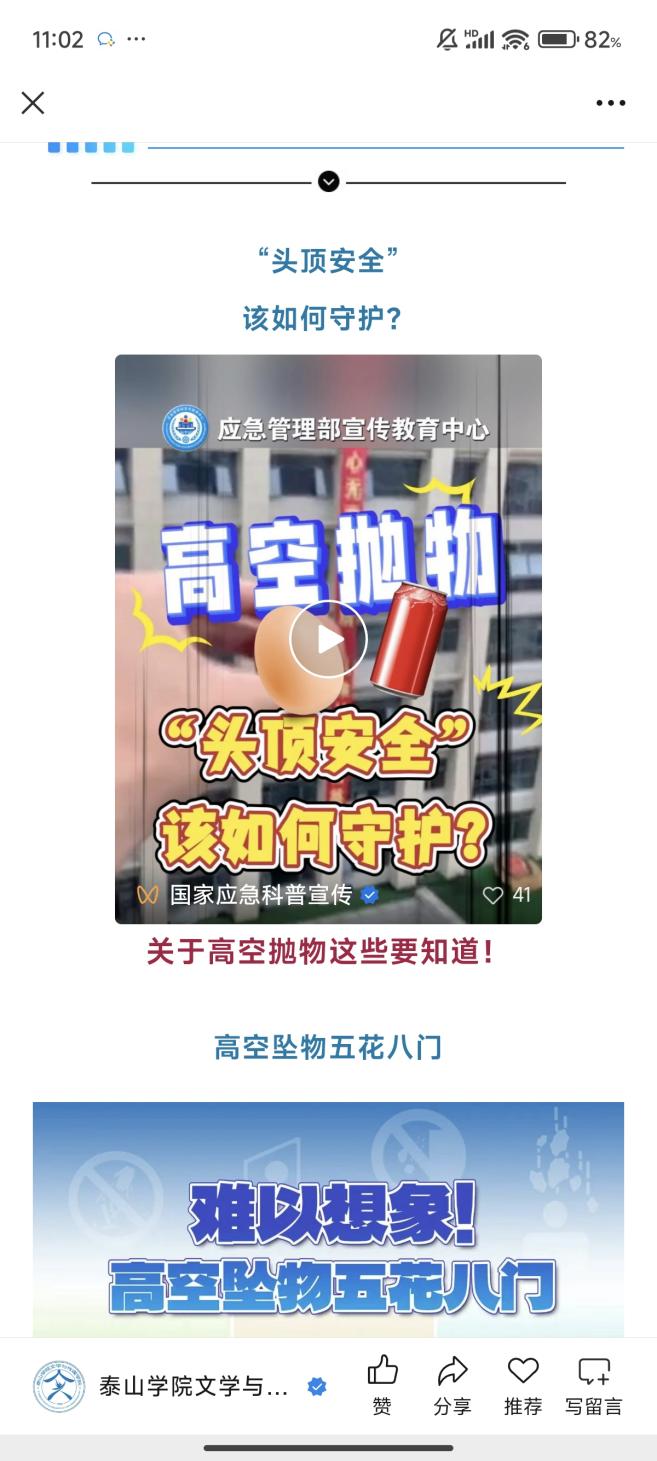 学院在官方微信公众号、官网等新媒体平台发布了“防范高空坠物”专题宣传材料,通过图文、短视频等形式普及安全知识,呼吁师生共同维护校园安全。此次宣传内容涵盖高空坠物的危害、常见隐患、预防措施及应急处理方法,并结合真实案例警示师生提高防范意识。特别提醒师生注意窗台、阳台物品摆放安全,避免因疏忽引发意外,同时倡导大家发现隐患及时上报,形成“人人讲安全、个个会应急”的良好氛围。