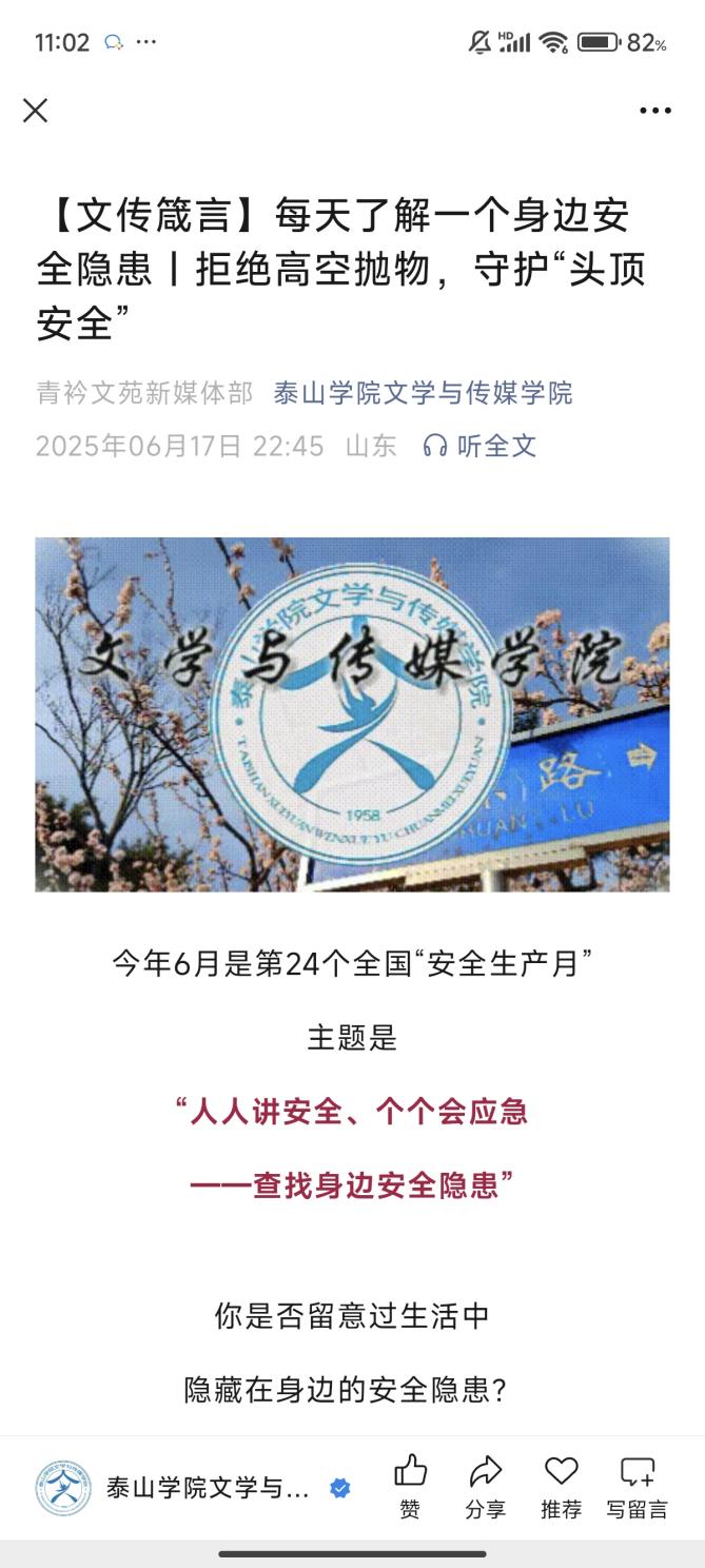 为切实增强学生校园安全意识,有效防范高空坠物安全隐患,营造平安和谐的校园环境。6月16日至19日,文学与传媒学院开展以“校园安全—防范高空坠物”为主题的教育活动。