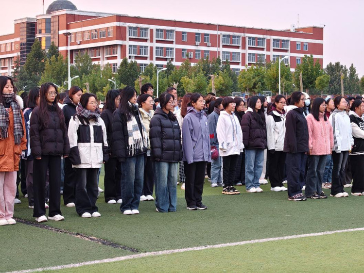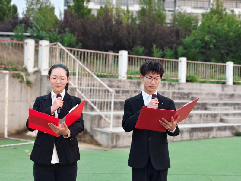晨光熹微,清风拂面,绿茵场上的新生们精神饱满地列队等候。伴随着铿锵有力的脚步声,国旗护卫队队员们肩扛国旗、昂首挺胸,迈着整齐划一的正步走向升旗台,每一步都尽显青春担当与使命荣光。当雄壮激昂的《义勇军进行曲》响彻操场,五星红旗迎着朝阳冉冉升起,全体师生肃立行注目礼,心中满是对祖国的崇敬与热爱,现场庄严的氛围感染着每一个人。