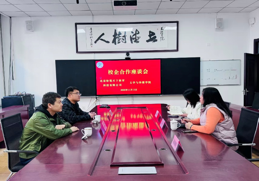 为精准对接行业需求、推动教育链与产业链深度融合,11月20日,文学与传媒学院与北京粉笔天下教育科技有限公司举行了校企合作座谈会。双方相关负责人齐聚一堂,围绕人才培养、资源共享、实践基地建设等核心议题展开深入磋商,共绘协同育人蓝图。