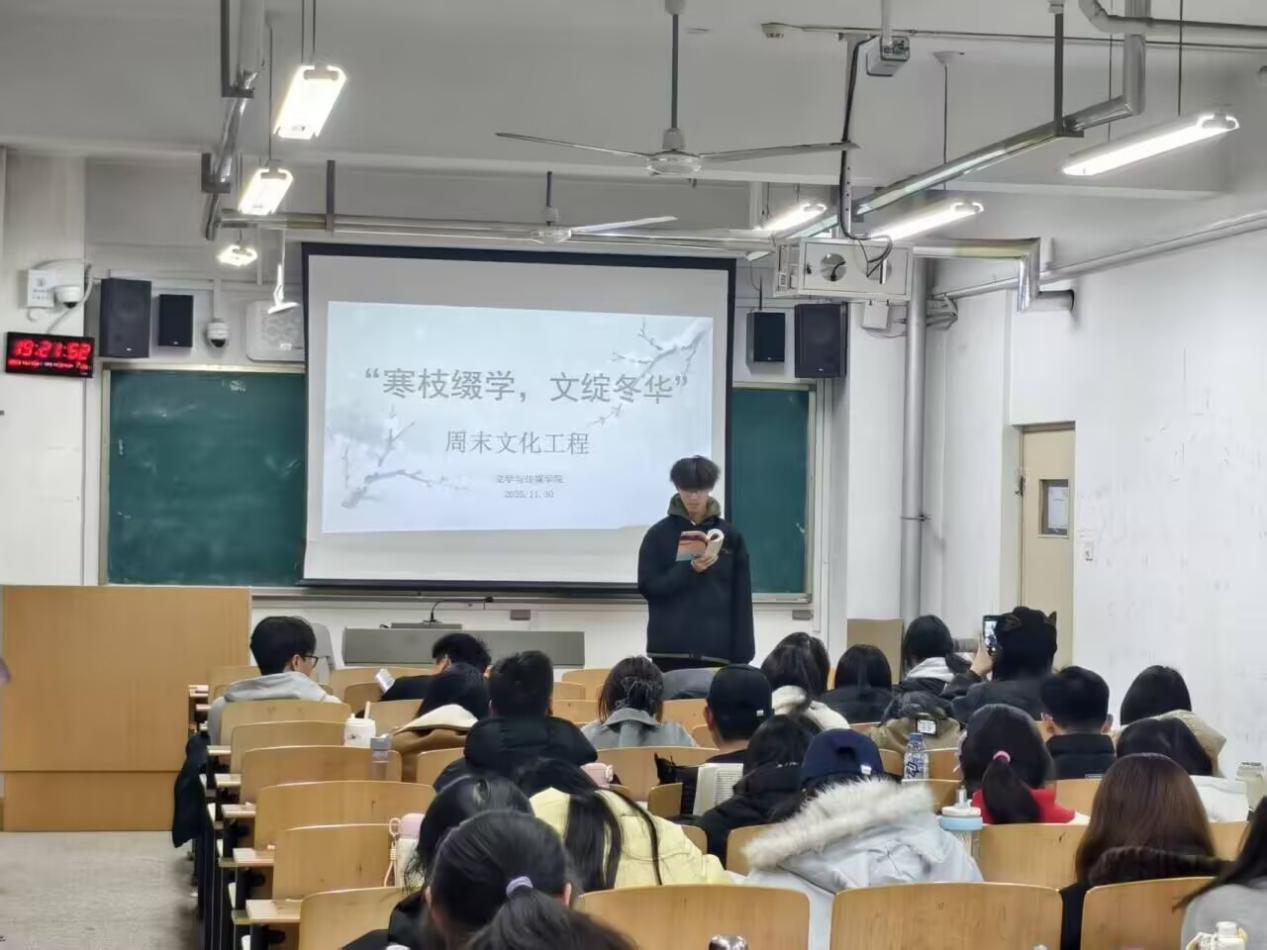 为深化学子对冬日文学的理解,推动经典文本与生活体验深度融合,11月30日,文学与传媒学院于新生一部综合楼B610教室开展“寒枝缀雪,文绽冬华”周末文化工程主题晚自习活动。