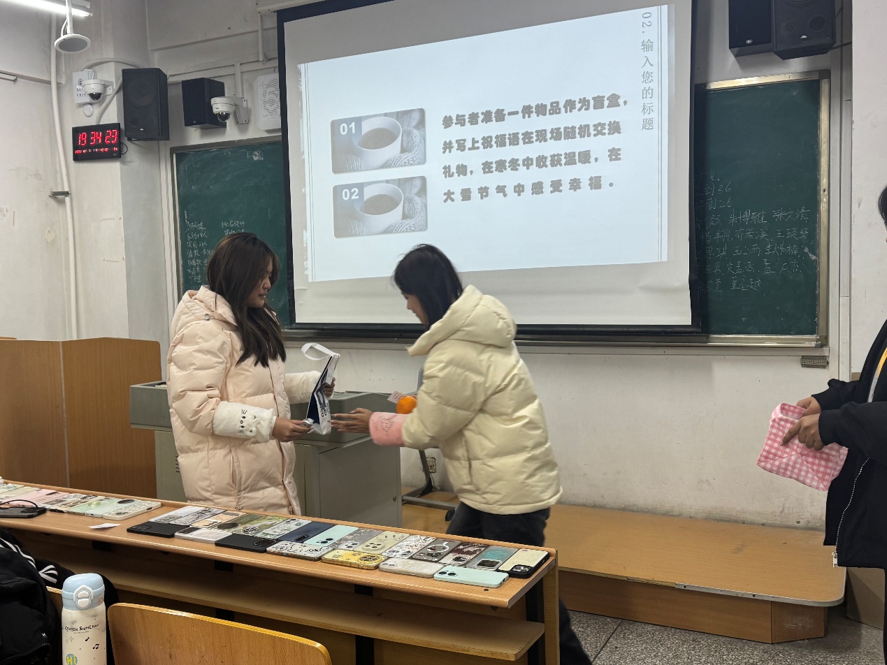 短片结束后,最受期待的“冬季节物与礼物交换”环节如期开展,同学们精心准备了承载冬日气息的节物、饱含心意的专属礼物,在轻松愉快的氛围中相互交换、分享故事,每一份礼物都传递着真诚的祝福,每一次交流都拉近了彼此的距离,现场欢声笑语不断,满是暖意融融的集体氛围。