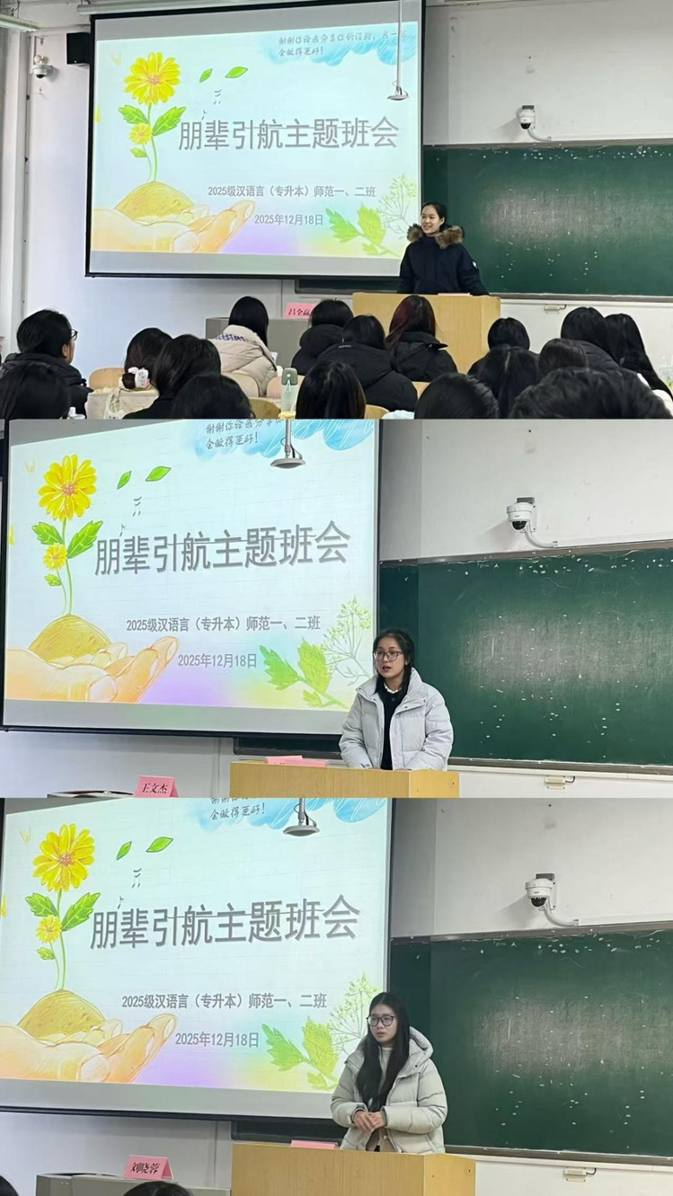 为丰富学生校园文化生活,引导专升本学生快速适应新阶段学习生活、科学规划学业发展,12月18日,2025级汉语言文学(专升本)师范一、二班于校本部二号综合教学楼A3011教室顺利召开“朋辈引航”主题班会。本次班会特邀2024级汉语言文学(专升本)师范班3名优秀学生代表分享学习、就业及升学经验,学院团委相关负责人及班主任全程出席指导。