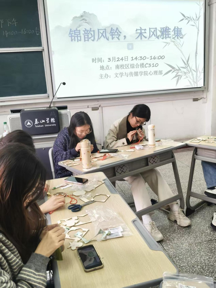 为传承中华优秀传统文化,舒缓同学们的学习压力,促进大学生心理健康教育,3月24日下午,文学与传媒学院于新生一部综合楼C310教室开展“锦韵风铃,宋风雅集”心理健康特色活动。本次活动由学院团委主办、学生会心理部承办,为同学们带来一场融合传统美学与手工趣味的春日盛宴。