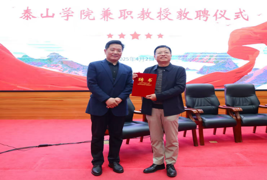 2025年4月2日下午,文学与传媒学院在国际交流中心报告厅隆重举行泰山学院兼职教授敦聘仪式暨耿成义教授学术报告会。本次学术报告活动是本年度“立人讲堂”校外专家学术讲座的第二场。泰山学院党委副书记贾军为耿成义教授颁发了兼职教授聘书。耿成义教授向母校捐赠了其著作《如寄》,泰山学院党委委员、副校长田杰昌向耿教授颁发了图书捐赠荣誉证书。随后,开展了耿成义教授学术报告会以及人文素养与文科人才培养展开学术座谈会。活...