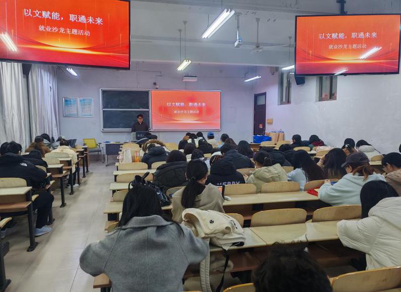 为切实提升2026届毕业生就业竞争力,搭建沉浸式职业能力锤炼平台,11月27日,文学与传媒学院在文A1013教室开展“以文赋能,职通未来”就业沙龙。2026届毕业生以及部分其他年级同学积极参加,通过多元实战形式交流求职经验,明晰职业方向。活动现场亮点纷呈,特色环节有序推进。在个人技能展示环节中,毕业生们模拟求职者身份,围绕专业特长、实习经历、职业规划登台分享,以清晰的逻辑、真挚的表达与从容的仪态展现文传学子的综合...