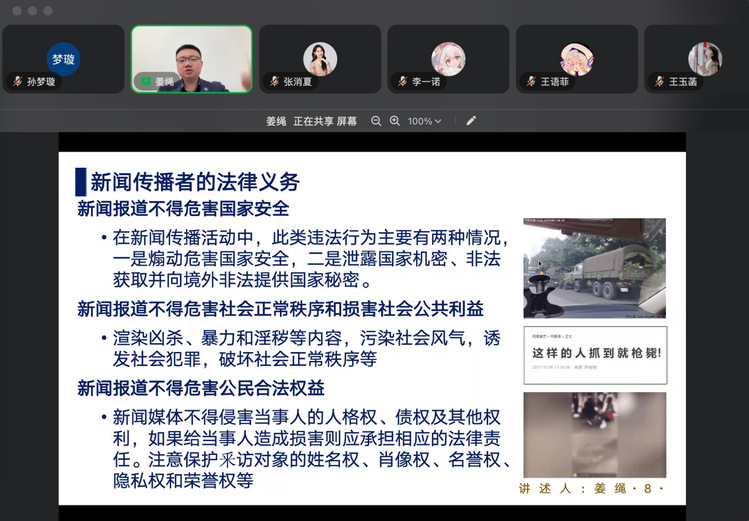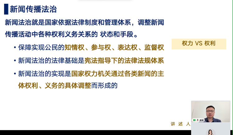 姜老师强调,新闻传播工作者在法治框架下享有并行使着多项关键权利,核心在于保障公民的知情权、参与权、表达权与监督权。行使这些权利需以区分“权力”与“权利”为前提,并在实践中与公民隐私权、肖像权等个人权益寻求合理平衡。同时,著作权保护构成行业基石,涵盖发表权、署名权、修改权与保护作品完整权等权利,以及许可、转让与获取报酬等财产权利。与之相关的邻接权,如表演者权、广播组织权等,进一步拓宽了知识产权保护体系;尤为重要的是,所有传播行为必须严守国家安全底线,作为新闻传播者更应警惕日常行为中潜在的信息泄露风险,在权利行使与义务履行间寻求动态平衡,共同守护法治社会的健康发展。