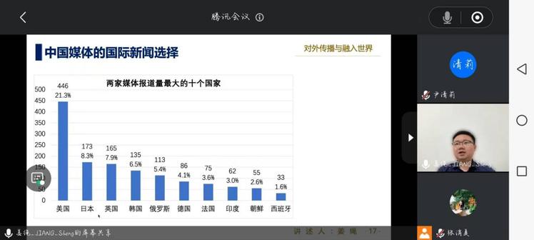 姜老师系统阐述了中国媒体在国际新闻报道中的角色演变与范式转型,指出中国媒体承担着“向国内说明世界、向国际展示中国、以中国视角向世界阐释全球事务”的三重使命,实现了从“革命型范式”到“发展型范式”再到“文明型范式”的历史性转变。通过姜教授对《人民日报》与《环球时报》进行的实证分析发现,中国媒体报道地域偏好集中于邻国、西欧和北美,其中美国、日本和英国最受关注,中国媒体的报道倾向显著影响着民众对国家的好感度,而国内生产总值(GDP)与对华贸易额则是影响报道量的关键因素。