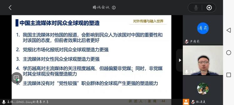 2025年9月25日,文学与传媒学院组织开展“立人讲堂”2025年首场专家线上专题讲座。本场讲座特邀的主讲嘉宾为上海外国语大学贤达经济人文学院副教授、上海外国语大学中国国际舆情研究中心项目助理姜绳老师,主题为《中国媒体的世界图像及民众全球观》。我院2023级广播电视编导专业全体同学及2024级网络与新媒体专业全体同学线上参会学习,讲座由学院张消夏老师主持。