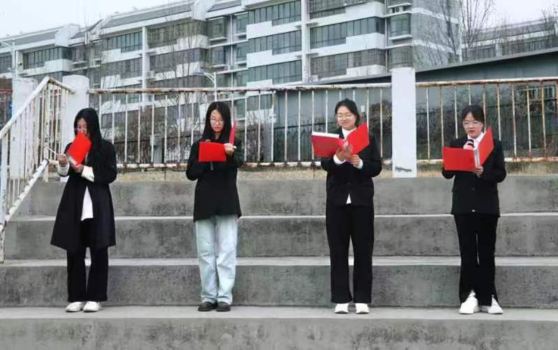 升国旗仪式正式开始后,在全体师生的注目礼下,英姿飒爽的国旗护卫队进场。伴随着激昂的《义勇军进行曲》,升旗手振臂一挥,鲜艳的五星红旗徐徐展开。场内全体人员面向国旗肃立致敬,行注目礼。随后,由23级学生徐佳悦、张兆敏、王璇、崔馨月共同朗诵《少年君子歌》,旨在培养学生们正直的品质,卓越的才能和远大的志向,勤学不倦。