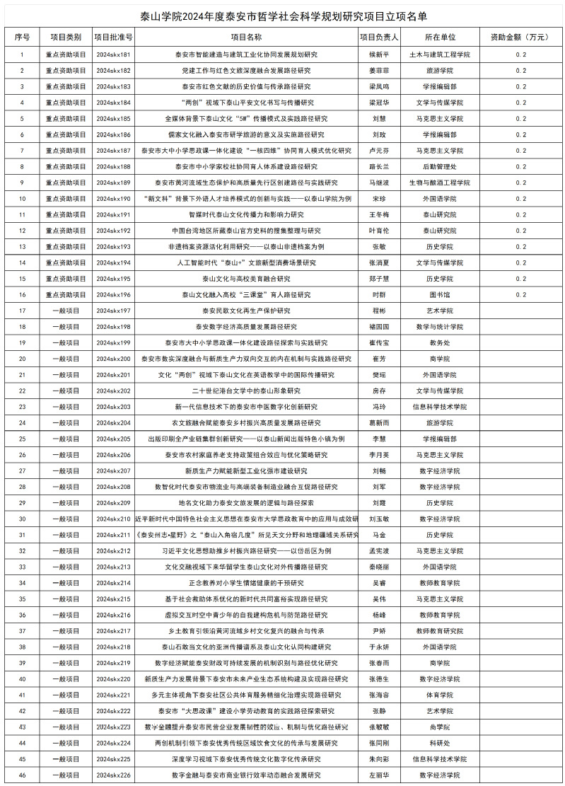 重点项目分别是 梁冠华老师的《“两创”视域下泰山平安文化书写与传播研究》,张消夏老师的《人工智能时代“泰山+”文旅新型消费场景研究》。一般项目是房存老师的《二十世纪港台文学中的泰山形象研究》。