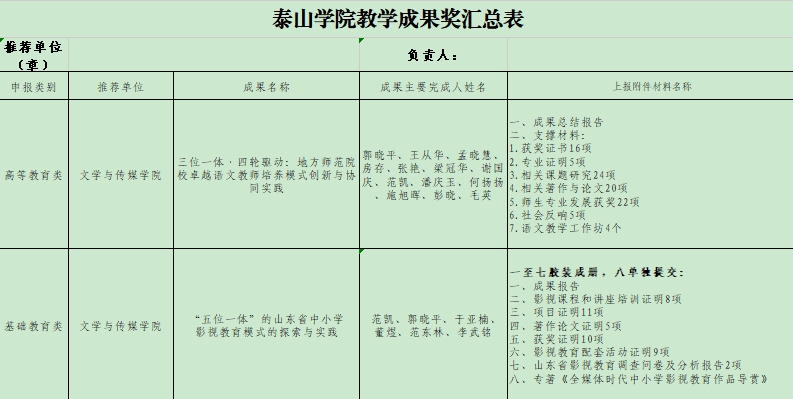 根据《关于做好省级教学成果奖预申报暨泰山学院2025年教学成果奖评选工作的通知》(教处字〔2025〕4号)有关要求,经完成人申报,学院组织专家评审,拟推荐“三位一体·四轮驱动:地方师范院校卓越语文教师培养模式创新与协同实践”、““五位一体”的山东省中小学影视教育模式的探索与实践”2项成果参加校级教学成果奖评选。