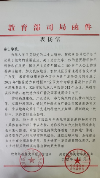 2月24月,教育部语言文字应用管理司、共青团中央青年发展部联合发来的表扬信,对我校参与2022年“推普助力乡村振兴”全国大中专学生暑期社会实践志愿服务活动表现突出的团队予以表扬。该活动全国共有958支队伍入围,826支高校团队完成实践活动并提交总结报告,经过两轮评选,最终共有165支队伍获评优秀团队,文学与传媒学院“泰院·朗朗之声大学生推普实践团”成功入选。2022年暑假期间,“泰院·朗朗之声”大学生推普实践团来到东平...