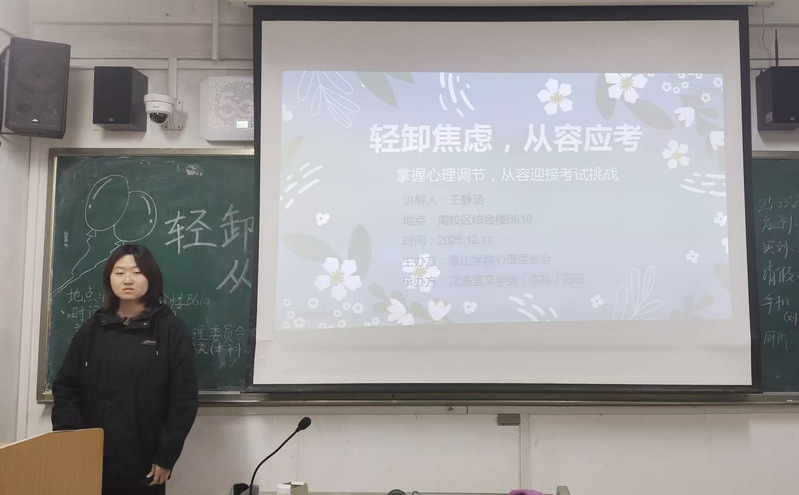 12月11日,文学与传媒学院在新生一部综合楼B610教室召开“轻卸焦虑,从容应考”心理班会。本次班会由学院学生会主办、心理部承办,旨在帮助同学们缓解备考压力,掌握心理调适方法,营造互助支持的备考氛围。随着期末考试等关键考试临近,部分同学出现注意力不集中、情绪波动等考前焦虑表现。此次班会立足学生实际需求策划开展,主持人首先引导同学们正视焦虑情绪,分析其普遍成因,减少自我否定与内耗。在随后的互动体验环节中,同...